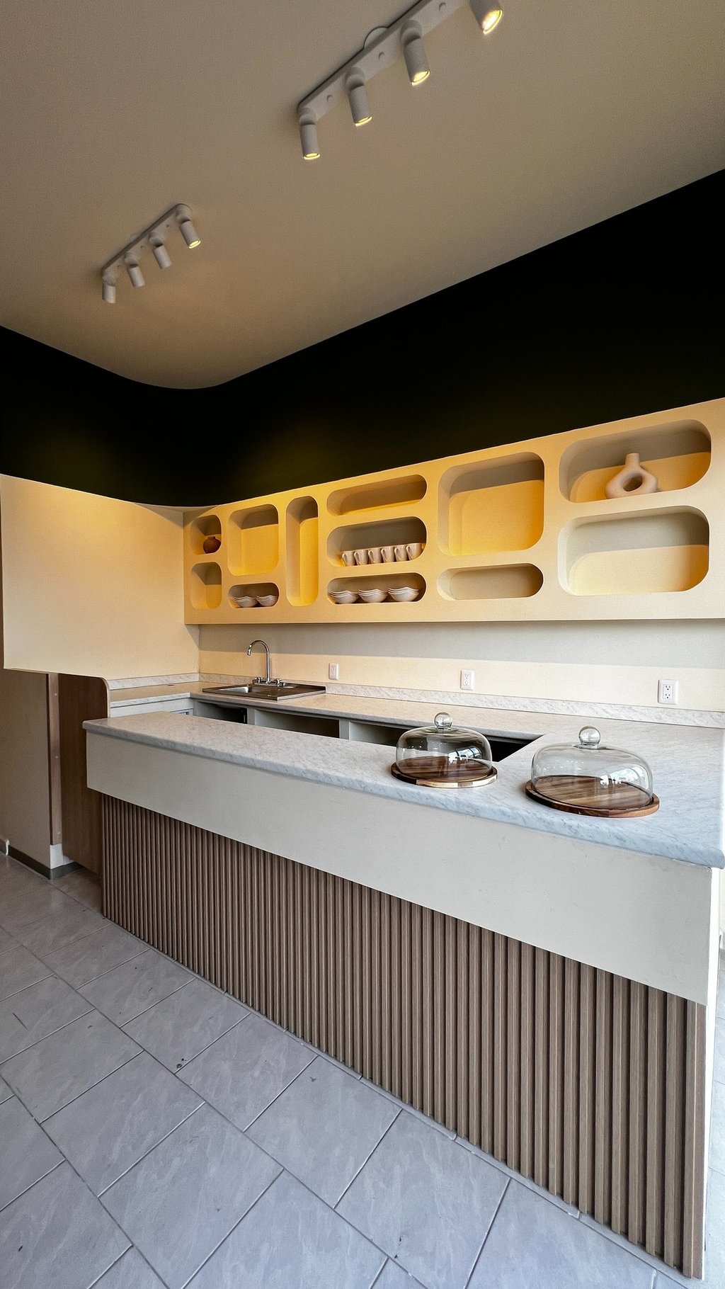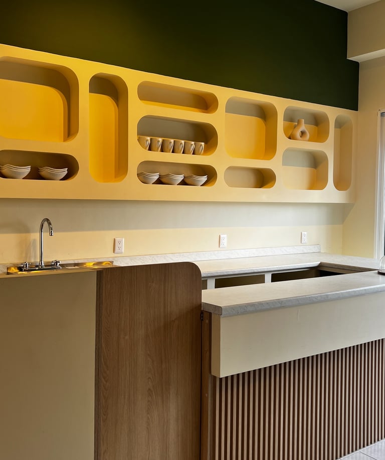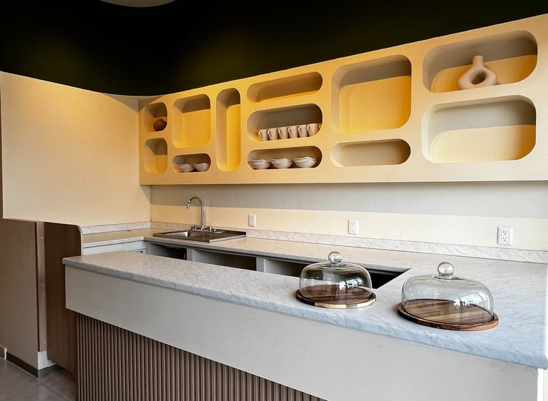 Para complementar la propuesta, se incorporó mobiliario y elementos decorativos con formas no ortogonales que rompen con la rigidez del espacio, aportando dinamismo y originalidad. Esta elección contribuye a reforzar la identidad del lugar, ofreciendo un entorno distintivo que invita a los clientes a disfrutar de una experiencia única.
